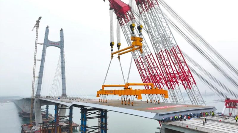 3月30日上午10時02分 隨著最后一塊鋼箱梁成功吊裝到位 陽江港大橋順利合龍 如一條巨龍橫臥海面 標志著廣東省濱海公路 海陵大堤段至溪頭段實現全線貫通 向通車目標邁出了重要一步! 陽江港大橋全長4777.2米 是廣東濱海旅游公路陽江海陵大堤 至溪頭段公路項目的控制性工程 由保利長大工程有限公司承建 巨力索具負責該項目鋼箱梁吊具制作 鋼箱梁采用大節(jié)段吊裝方案,分6個節(jié)段 最大梁段長90米,最小梁段長74.5米