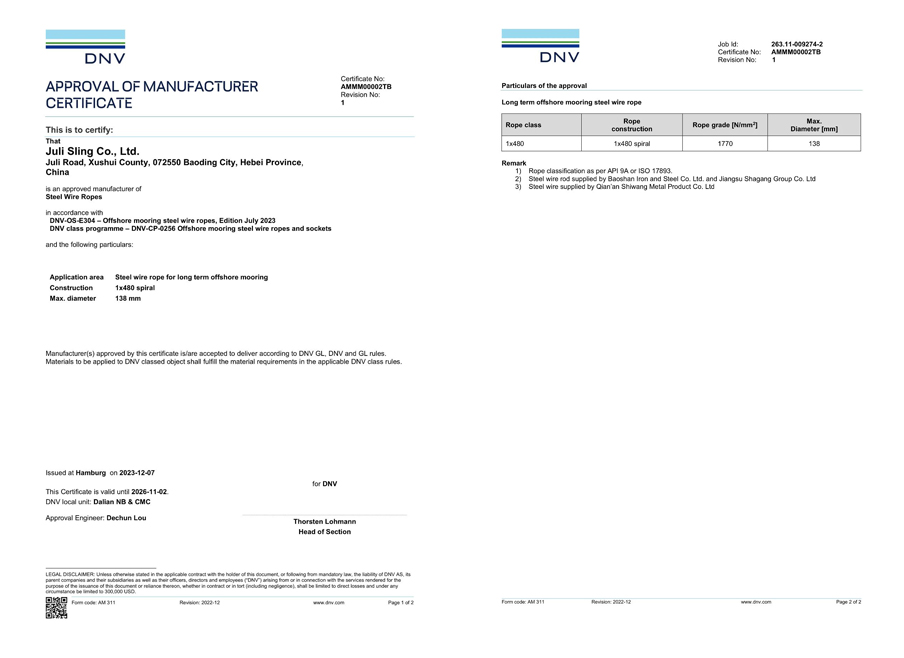 2020年11月,巨力索具取得了永久系泊用單股涂塑鋼絲繩的DNV·GL工廠認(rèn)可證書,成為國(guó)內(nèi)首家通過(guò)該類鋼絲繩DNV·GL工廠認(rèn)可的廠家。