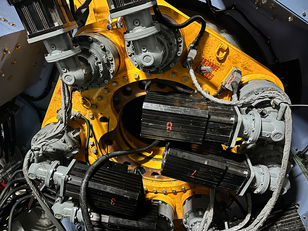 單葉片吊裝配套的盤(pán)車(chē)工裝采用創(chuàng)造性的8個(gè)電機(jī)驅(qū)動(dòng),優(yōu)秀的控制程序,均衡了驅(qū)動(dòng)的受力。機(jī)載控制面板和手持平板電腦均可查看和控制盤(pán)車(chē)使用過(guò)程。剎車(chē)裝置采用電機(jī)抱閘剎車(chē)和機(jī)械剎車(chē)雙重保障。