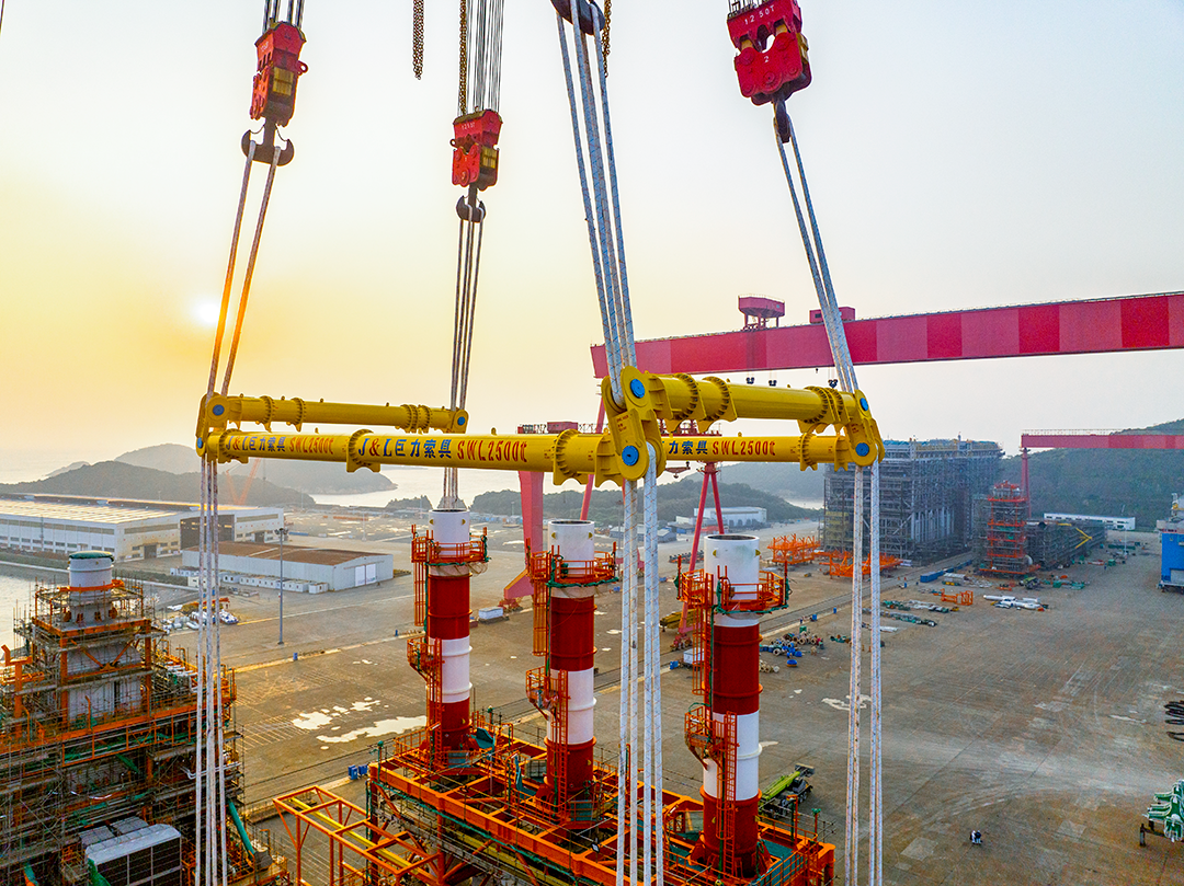 在裝置建造過(guò)程中,巨力索具承擔(dān)了該“海上移動(dòng)化工廠”上部模塊的吊裝集成任務(wù),為項(xiàng)目量身定制了5000T吊梁系統(tǒng)。這套裝備需承受FLNG模塊吊裝過(guò)程中的動(dòng)態(tài)載荷,技術(shù)要求遠(yuǎn)超常規(guī)海工項(xiàng)目,是項(xiàng)目建設(shè)中技術(shù)難度最高、風(fēng)險(xiǎn)最大的環(huán)節(jié)之一。