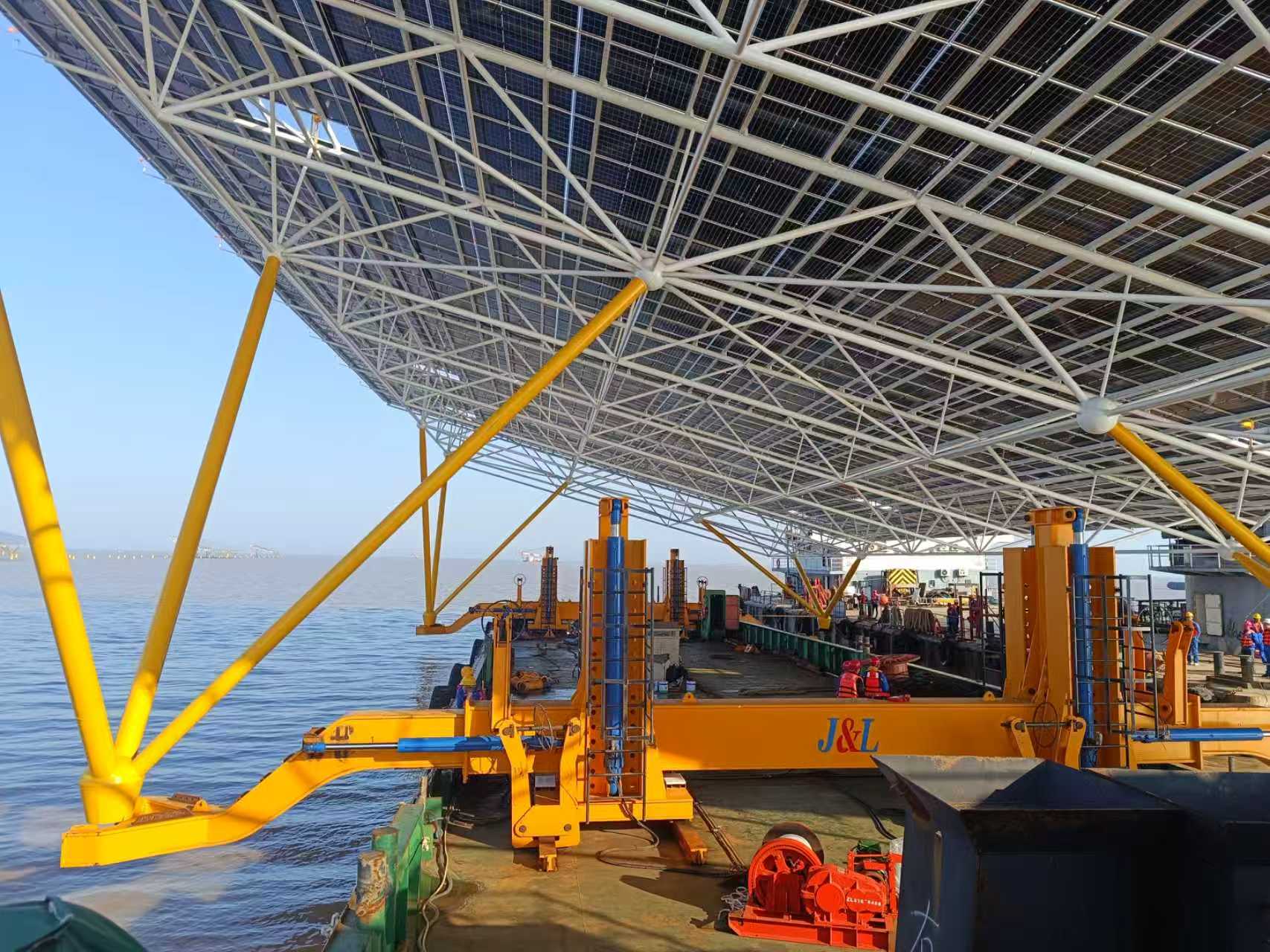 海上光伏整體結構浮托運輸調節(jié)裝備是利用駁船在淺海對光伏組件整體結構進行浮托運輸、安裝的裝備。本裝備通過創(chuàng)新設計舉升系統(tǒng)、伸縮梁等關鍵部件,有效提升了光伏組件整體結構安裝的施工效率、施工穩(wěn)定性以及安裝精確性,同時解決了安裝空間受限等問題。為海上光伏組件提供了一套可在從運輸到安裝的整體解決方案,降低了浮吊船的使用頻率,降低海上光伏運輸和安裝的成本,提升了海上光伏的安裝效率,有效推動了整個產業(yè)鏈的技術升級。