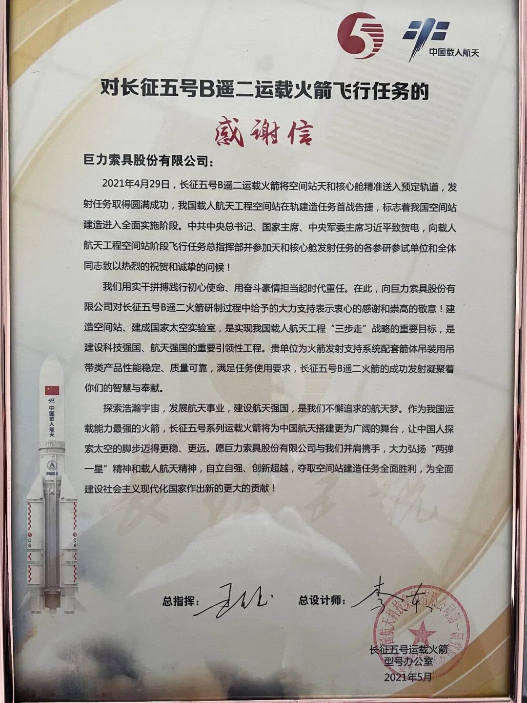 日前,巨力索具股份有限公司收到中國(guó)航天科技集團(tuán)第一研究院發(fā)來(lái)的感謝信,向巨力索具對(duì)長(zhǎng)征五號(hào)B遙二運(yùn)載火箭飛行任務(wù)和研制過(guò)程中給予的大力支持表示衷心的感謝。