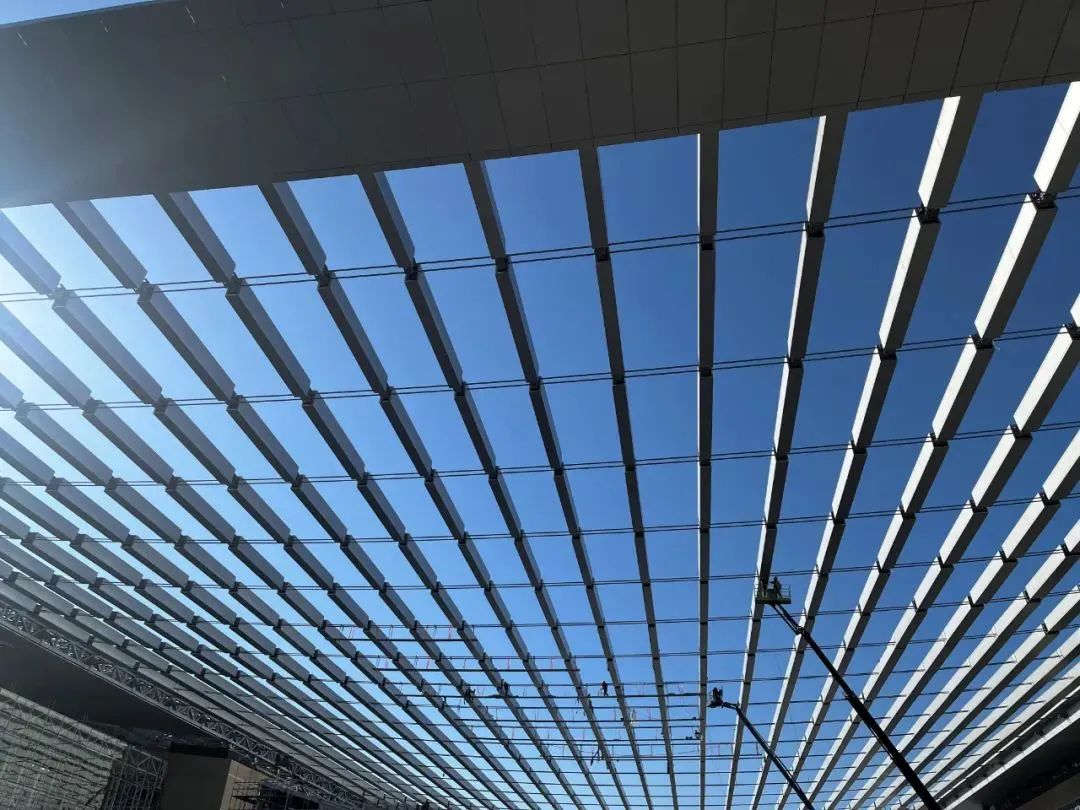 就拿高難度的拉索安裝來說,矢高約3.5米的超大弧形懸索鋼屋蓋,每榀桁架起吊后,需要找到最適宜的角度做成傾斜狀態(tài)。其中最長的桁架,連續(xù)跨度可達(dá)120米左右。大屋面由“雙向鋼桁架+跨中拉索結(jié)構(gòu)”組成,中央?yún)^(qū)域110米全懸空的懸鏈態(tài)由兩側(cè)邊桁架及中間36根直徑為70毫米的不銹鋼拉索組成,施工牽引張拉、精度、溫度、雙索的扭曲偏轉(zhuǎn)是無可回避的難題。