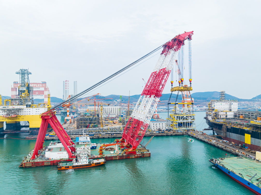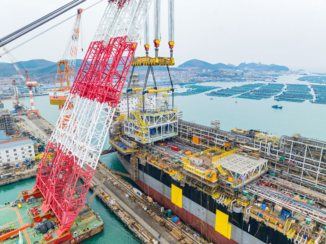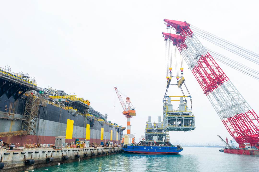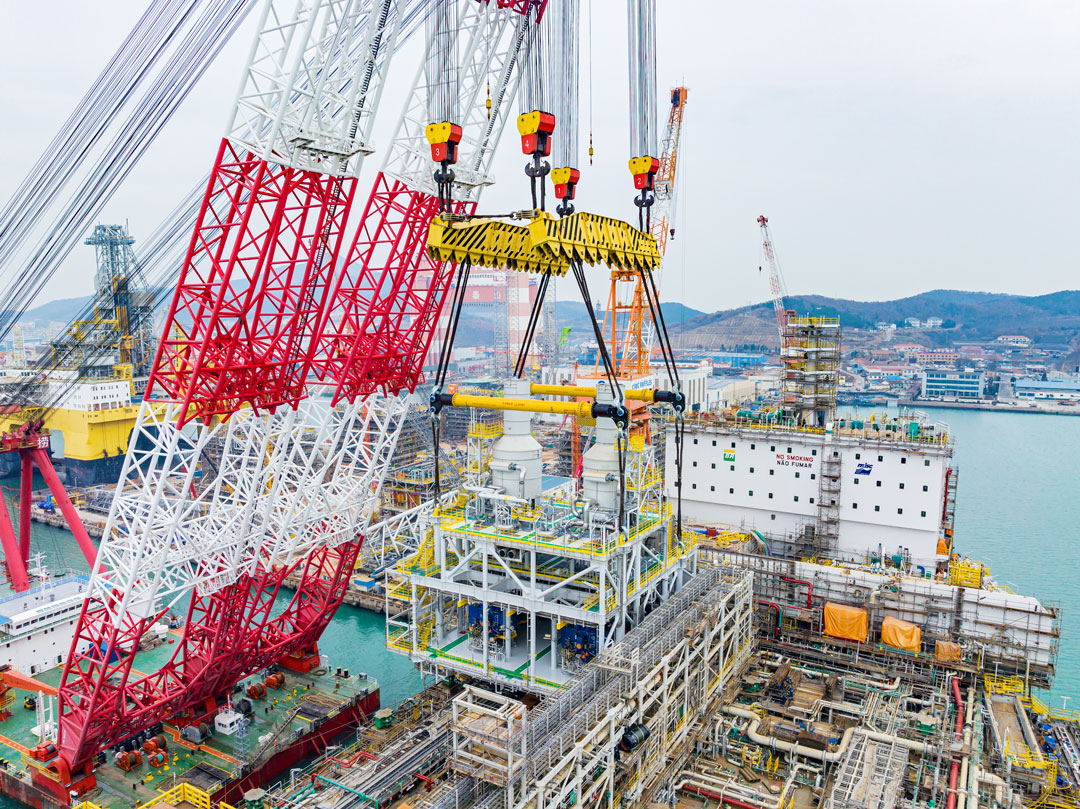 近日,中集來福士浮式生產(chǎn)儲油船(FPSO)重為3669噸的S20、2960噸的P60、2766噸的P20三大模塊吊裝完成。巨力索具為其提供了承載量為3000噸、2500噸的平衡梁梁式吊具、卸扣、無接頭繩索等產(chǎn)品,并為保證吊裝的順利進(jìn)行制訂了嚴(yán)謹(jǐn)?shù)牡跹b方案。
