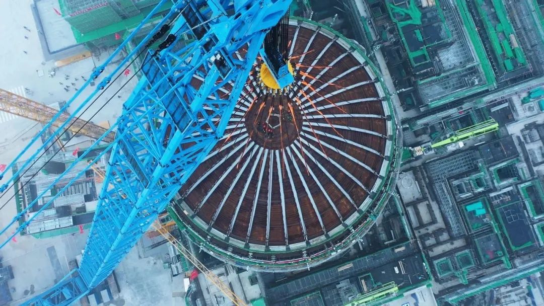 吊裝過程中,穹頂宛如一個巨型“帽子”,它是保證反應(yīng)堆廠房安全殼完整性和密封性的重要組成部分。據(jù)了解,本次穹頂?shù)跹b呈現(xiàn)整體吊、物項多、總重大、精度高等特點,包含鋼襯里結(jié)構(gòu)以及支撐籠架、部分鋼筋和預(yù)應(yīng)力導(dǎo)管、全部貫穿件、加強(qiáng)板、內(nèi)部鋼結(jié)構(gòu)、設(shè)備支吊架、噴淋系統(tǒng)、照明系統(tǒng)、消氫裝置、換熱器設(shè)備、探測設(shè)備等設(shè)備,總重量為739.016噸。