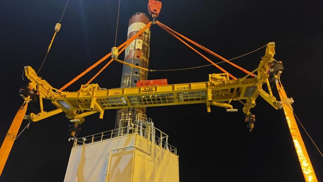 巨力索具為本次全程吊裝保駕護(hù)航,提供的50噸折疊式海上單葉片吊具實(shí)現(xiàn)單個風(fēng)電葉片在空中與輪轂的對接安裝。