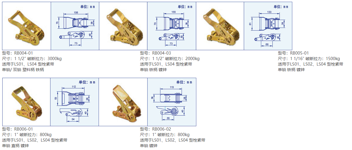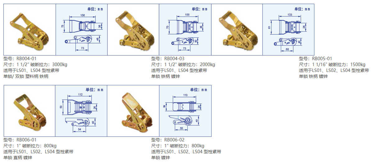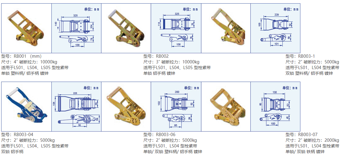 | 產(chǎn)品型號(hào) | 適用尺寸 | 破斷拉力(kg) | 規(guī)格大小(mm) | 表 面 | 適合型號(hào) | |||